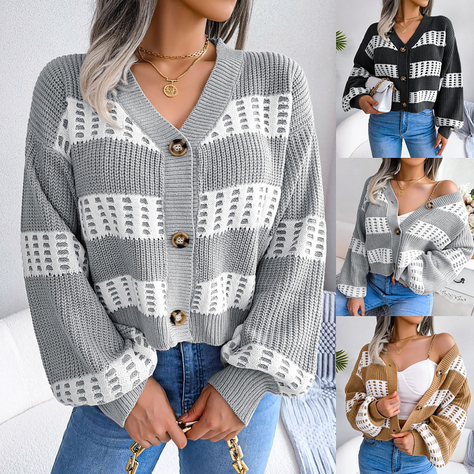 Miarhb Women S Autumn And Winter Temperament Spell Color Cardigan Sleeve Cardigan Sweater Jacket Walmart Com